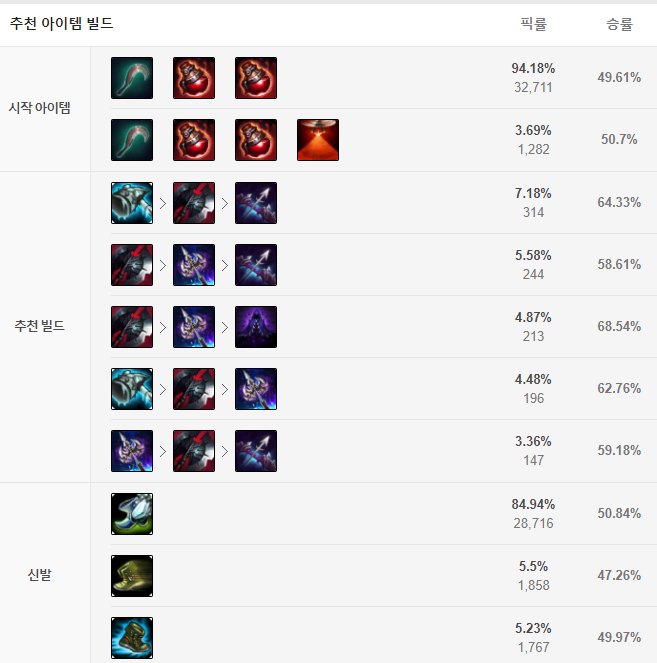그림자 검을 띄워준 이후에는 상황에 맞게 상대방에 피흡 챔피언이 많으면 필멸자의 운명 아이템을, 너무 자신이 물려서 짤리는 경우에는 밤의 끝자락 아이템을 추천드립니다.