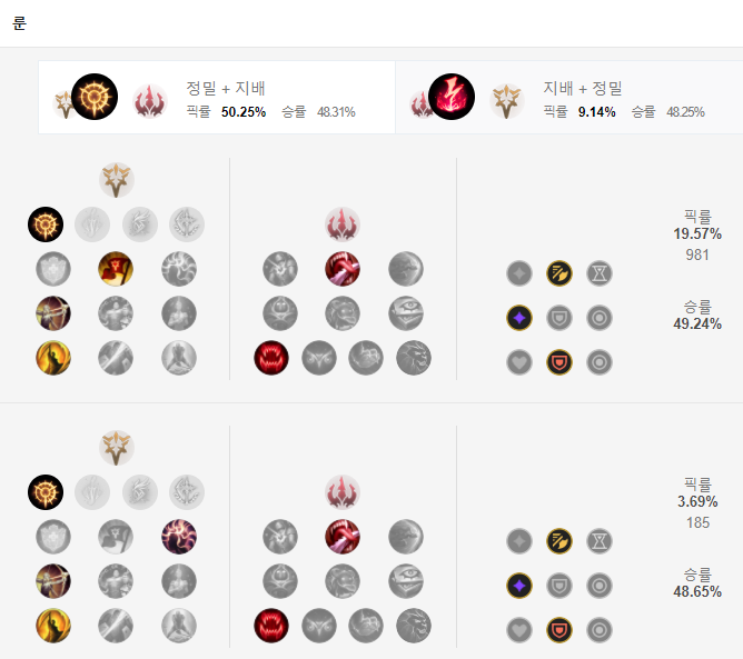 칼바람 퀸 룬은 정밀의 집중 공격을 들어줍니다. 평타 E 평타 평타로 손쉽게 터뜨릴 수 있죠. 하위 룬으로는 승전보, 전설: 민첩함, 쵤후의 일격을 들어주고 보조룬으로는 피흡을 위한 피의 맛, 굶주린 사냥꾼을 들어주면 되겠습니다.