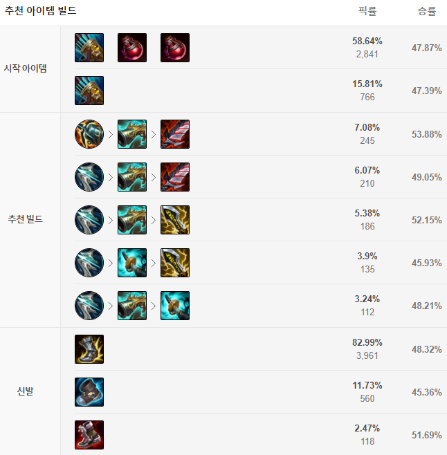 퀸은 기본적으로 원거리 딜러라서 크라켄 학살자를 올리는 경우도 많지만 저는 개인적으로 돌풍을 먼저 올리는 것을 추천드립니다. 돌풍으로 E스킬 각을 더 쉽게 만들수도 있고 또 투사체 스킬을 회피하는데도 사용하는 등 가용성이 넓기 때문이죠. 두 번째 코어 아이템으로는 징수의 총, 세 번째 코어 아이템은 피바라기를 올려주면 됩니다. 신발은 첫 번째 코어 아이템을 띄워준 뒤 광전사의 신발을 구매해주시면 됩니다.
