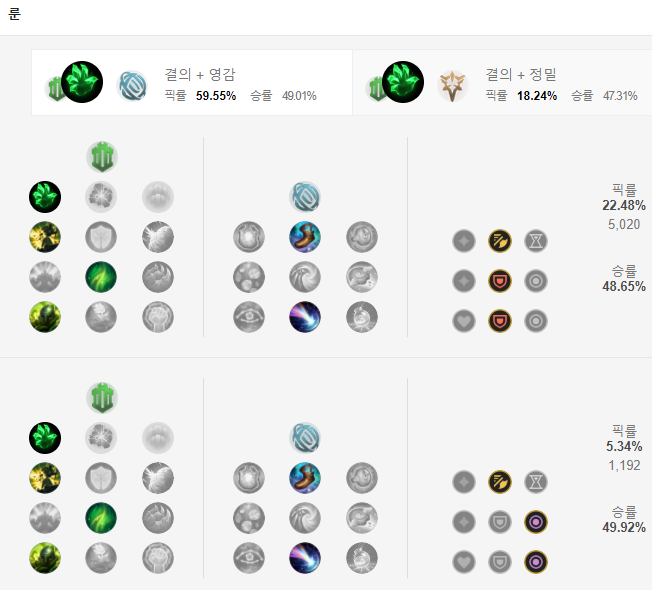 현재 가장 많이 사용되는 룬은 결의에서 착취의 손아귀입니다. Q를 맞추고 따라가서 평타를 치거나 혹은 상대가 평타를 치러 올때 E를 쓰고 강화 평타를 치거나 하는 일이 흔하기 때문이죠. 그렇게 스택을 쌓아서 전체 체력을 쌓아주면 쌓일수록 더 체력이 늘어나겠죠? 하위 룬으로는 철거, 재생의 바람, 과잉성장을 들어주고 보조룬에는 보통 영감에서 마법의 신발과 쾌속 접근을 들어줍니다. 쾌속 접근의 효과로 Q스킬을 맞추고 맞춘 적에게 향할 때 이동 속도가 더 빨라집니다.