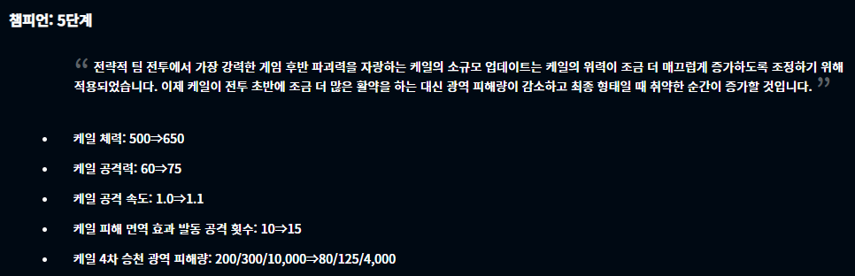 케일은 5코스트 챔피언이지만 시간을 오래 끌어야 굉장히 강해졌습니다. 그렇지만 시간을 오래 끌지 못하고 죽는 경우가 너무 많았죠. 이를 인지하고 전투 초반에 더 강하게, 대신 후반에는 조금 약하게 패치되었네요.