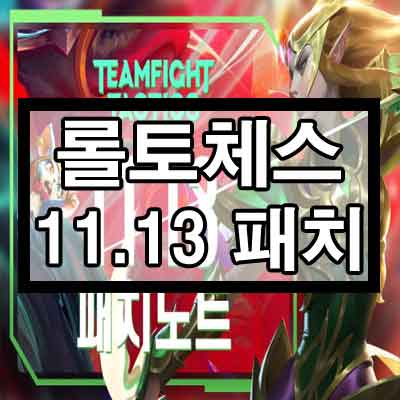 이번에 알아볼 것은 6월 23일 적용된 롤토체스 11.13 패치노트입니다. 과연 어떤 챔피언들이 어떻게 변경되었고, 또 특성들은 어떻게 바뀌었는지, 아이템은 무엇이 바뀌었는지 한번 이것저것 알아보도록 하겠습니다.