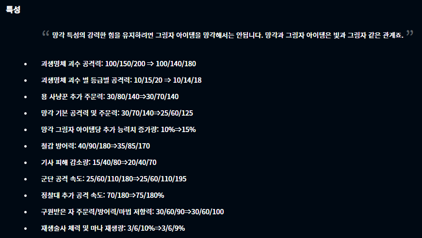 망각 특성 기본 공격력 및 주문력이 살짝 너프되었습니다. 그 대신 망각 그림자 아이템당 추가 능력치 증가량이 많이 증가했네요. 이로서 망각덱을 올리려면 그림자 아이템이 필수가 되었습니다. 또 괴생명체 특성의 경우 아군 괴생명체 특성 챔피언이 죽으면 나오는 괴생명체가 굉장히 강력했습니다. 그렇기에 살짝 너프를 해준 모습입니다. 그 외에도 대부분 특성에서 살짝 능력치 조정이 있습니다.