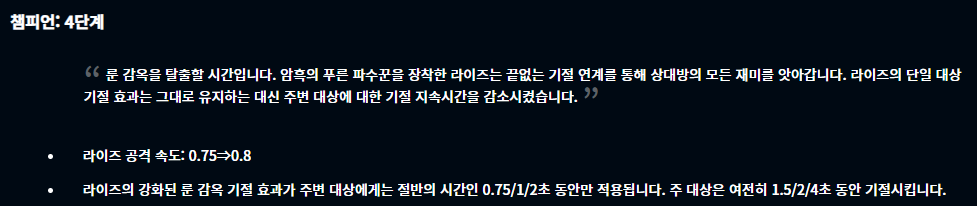 라이즈의 스킬 중 두 번째로 스킬을 쓰면 주변 적까지 기절시키는 모습을 보여줬는데 이게 좀 그랬나봅니다. 대상 주변의 적들의 경우 기절 지속시간이 감소되었네요.