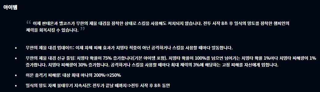 그림자 아이템을 섞어서 만든 무한의 제물 대검은 치명타 피해를 입힐 때 마다 체력이 감소하는 효과가 있습니다. 그렇기 때문에 판테온이나 벨코즈가 스킬을 쓰면 한방 데미지가 아니라 수많은 데미지들이 터지기에 그대로 자멸하는 경우가 많았죠. 그렇기 때문에 이를 패치해주었고, 또한 이온 충격기가 상향되었으며 일시의 망토 불태우기 지속시간도 줄어들었습니다.