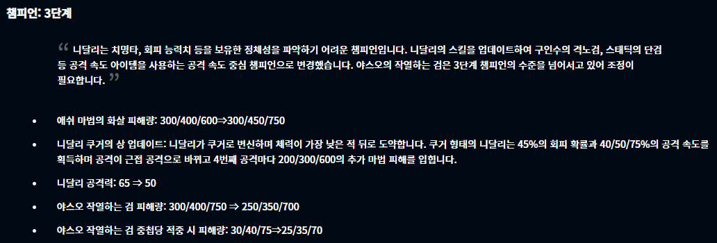 애쉬의 경우 스킬 딜링이 증가했고 니달리는 공격 속도 아이템을 주면 더 잘 어울리는 챔피언이 되었습니다. 또한 야스오는 스킬 데미지 너프를 당한 모습입니다.