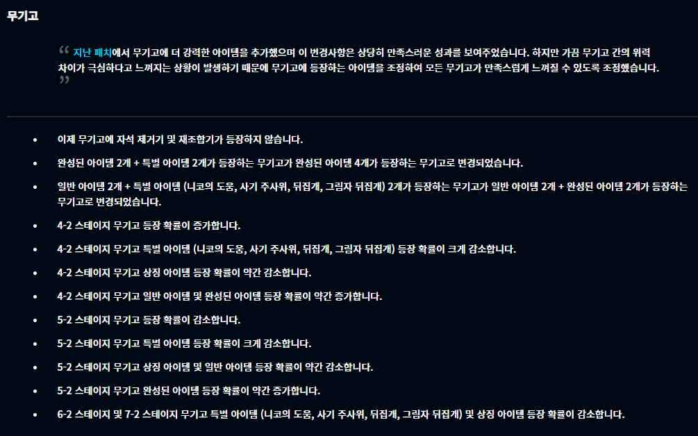 가끔씩 X-2 스테이지마다 등장해서 무작위 아이템중 하나를 선택할 수 있게 해주는 무기고 시스템, 이 무기고에서 이제 더 이상 자석 제거기 및 재조합기가 등장하지 않는다고 합니다. 또 각 스테이지 무기고별로 여러 확률이 조금씩 변경되었으니 확인해주시면 되겠습니다.