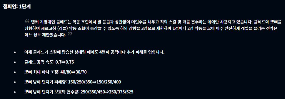 1단계 챔피언에서는 클레드와 뽀삐가 크게 변경되었습니다. 전체적으로 상향되었는데요, 그렇기 때문에 초반 5레벨이 되기 전 리롤을 다 돌려서 빠르게 1코스트 챔피언을 3성으로 만드는 리롤 전략이 다시 나올까 기대되기도 합니다.
