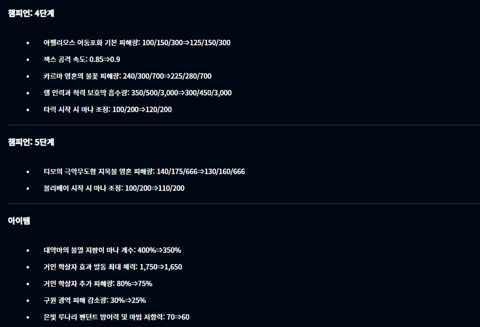 뭐 위의 내용들은 이제 살짝씩 조정한 느낌입니다. 너무 강력했던 럭스도 너프되었고 카르마 역시 너프되었습니다. 또 다양한 덱에 자주 사용되었던 렐 역시 보호막 흡수량이 너프되었으며 다른 챔피언들 및 아이템들도 조금씩 버프, 너프 되는 모습을 보여줬습니다.