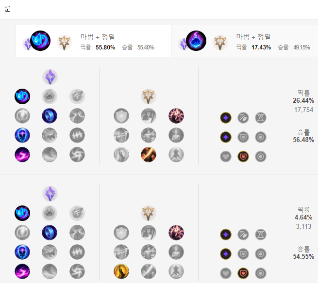 유미의 룬은 공격 및 수비에 둘 다 적합한 마법의 콩콩이를 주 룬으로 사용합니다. 하위 룬으로는 마나를 위한 마나순환 팔찌, 쿨감을 위한 깨달음, 조금이라도 딜링을 늘리는 주문 작열을 들어주시면 되고 보조룬에는 정밀의 마나를 위한 침착, 보통 유미보다 상대가 체력이 높은 경우가 많으니 체력차 극복을 들어주시면 됩니다.