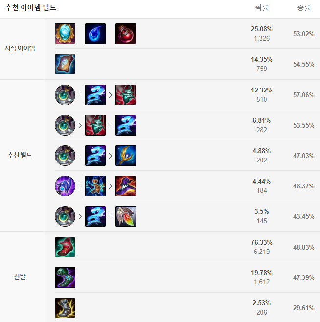 처음 시작은 밴들유리 거울과 여신의 눈물, 포션 1개로 시작해줍니다. 유미의 스킬들, 특히 E스킬이 마나 소모가 크기 때문에 이를 어느정도 커버하고자 여신의 눈물을 올리는 것이죠. 첫 코어 아이템은 아군을 서포팅할때 좋은 월석 재생기를 올려주시면 되고 그 이후에는 흐르는 물의 지팡이와 불타는 향로 아이템을 올려주시면 됩니다. 신발은 첫 번째 코어 아이템을 띄운 뒤 아이오니아 신발을 올려주시면 되고 그 이후에는 구원이나 대천사의 지팡이를 올려주는 것을 추천드립니다.