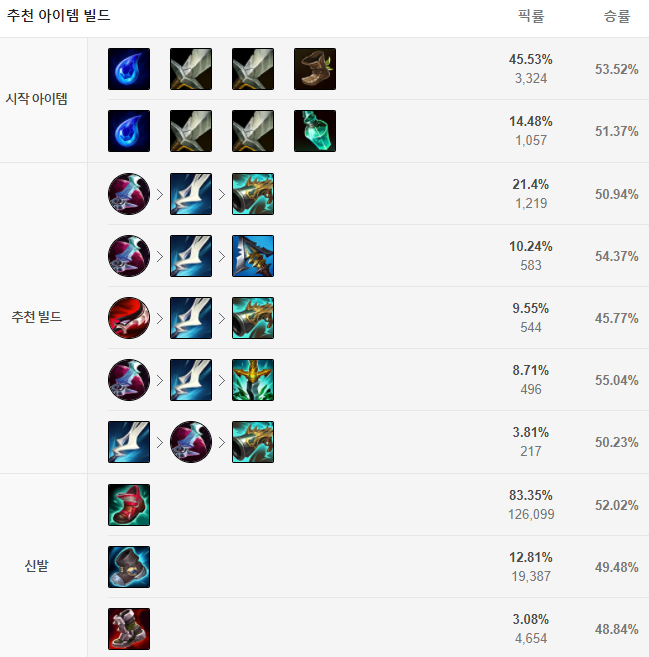 처음 시작에는 여신의 눈물과 롱소드 2개, 신발을 구매해주시는게 제일 딱 알맞게 돈을 쓸 수 있습니다. 이후 첫 번째 코어 아이템으로는 월식을 올려주시고 그 다음 마나무네까진 고정입니다. 신발의 경우는 첫 번째 코어 아이템을 띄워준 뒤 쿨감신을 올려주는게 보통이구요. 이후에는 상황을 보고 징수의 총, 세릴다의 원한, 독사의 송곳니 등을 올려주시면 되겠습니다.