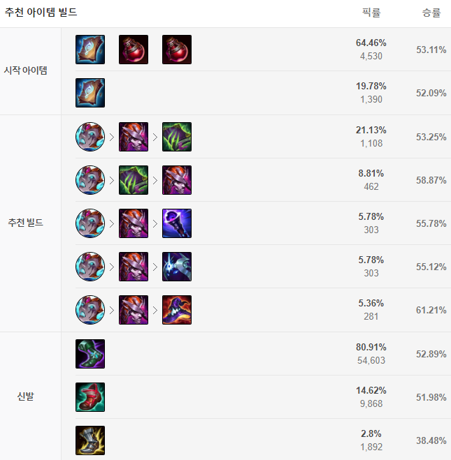티모는 먼저 시작 아이템으로 사라진 양피지와 포션 2개를 올려줍니다. 이후 첫 코어 아이템으로 리안드리의 고뇌를 올려주시고 마관신을 올려준 뒤 악마의 포옹, 모렐로노미콘을 순서대로 올려주는게 정석입니다. 이후에는 상황을 보고 기동력이 필요하면 우주적 추진력, 자꾸 물려서 죽으면 존야의 모래시계, 딜이 부족하면 라바돈의 죽음모자, 상대 마법 저항력이 높으면 공허의 지팡이를 올려주시면 됩니다.