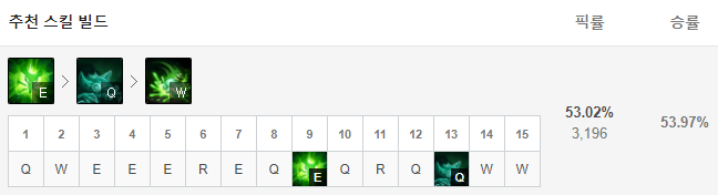 처음 3레벨에는 Q, W, E스킬을 하나씩 찍어주고 이후에는 R-E-Q-W 순서로 스킬을 올려주시면 됩니다. 트위치의 경우 평타나 W로 적 챔피언에게 스택을 쌓은 뒤 E스킬로 터뜨리는게 은근 데미지가 좋은데 그런 이유로 궁극기를 제외한 스킬중 E를 먼저 마스터해주는 것입니다.