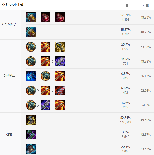 보통 처음 시작 아이템은 절정의 화살과 포션 두 개로 시작합니다. 이후 첫 코어 아이템으로 크라켄 학살자를 올리고 광전사의 신발을 올려준 뒤 루난의 허리케인까지는 고정입니다. 그 다음에는 공격속도 및 흡혈이 더 필요한 것 같다하면 몰락한 왕의 검을, 그냥 딜링이 더 필요하다 싶으면 무한의 대검을 올리시면 되고 이후부터는 상황에 맞게 피바라기, 멜모셔스, 시미터, 도미닉 등을 올려주시면 되겠습니다.