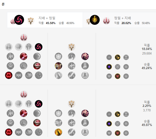 트위치의 주 룬은 보통 칼날비를 사용합니다. 어느정도 아이템이 나온 뒤 Q스킬로 은신을 하여 개피인 적이나 혼자 있는 물몸 챔피언에게 다가가 W와 칼날비 평타 3방, 거기에 E스킬까지 터뜨리면 암살도 가능해지죠. 하위 룬으로는 피의 맛, 사냥의 증표, 굶주린 사냥꾼을 들어주고 보조룬에는 정밀의 침착과 전설: 민첩함을 들어주시면 되겠습니다.
