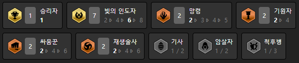 이 덱에서 챙길 수 있는 시너지는 승리자(1), 빛의 인도자(6), 망령(2), 기원자(2), 싸움꾼(2), 재생술사(2)입니다. 혹 9레벨을 찍는다면 리븐을 넣어서 빛의 인도자(8) 시너지를 챙겨줄 수도 있겠죠? 하지만 이 덱에서 리븐을 제외한 이유는 대신 볼리베어를 넣어 빛의 인도자(8)보다 망령(2), 싸움꾼(2) 시너지를 챙기는게 더 효율적이기 때문입니다. 특히나 볼리베어의 스킬은 굉장히 넓은 범위의 적들을 공중으로 띄어 무력화시키죠.