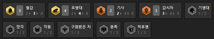 이 덱에서 챙길 수 있는 시너지는 철갑(3), 포병대(4), 기사(2), 감시자(3)입니다. 철갑(3)과 기사(2)로 인해 어느정도 안정적인 탱킹이 가능하고 포병대(4)로 범위 딜을 넣는게 가능해지죠. 거기에 감시자(3) 시너지까지 더해져서 실드가 돌아가기 때문에 더 잘 버틸 수 있게됩니다.