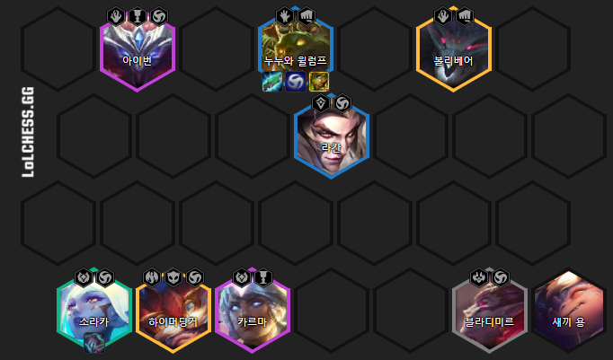 재생술사 누누덱의 최종 완성은 다음과 같습니다. 블라디미르, 소라카, 라칸, 누누와 윌럼프, 카르마, 아이번, 볼리베어, 하이머딩거로 이루어져 있죠. 보면 알 수 있다시피 구성 챔피언 평균 코스트가 높으며 그로 인해 초반은 조금 어려울 수 있습니다. 배치의 경우 간단하게 메인 탱커 및 어그로 담당으로 아이번, 누누, 볼리베어를 앞라인에 두고 라칸을 그 뒷줄, 나머지 소라카, 하이머딩거, 카르마, 블라디미르를 맨 뒤에 배치해주시면 되겠습니다.