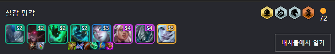 철갑 망각덱의 아이템은 미스 포츈에게 대천사의 지팡이(지팡이+여눈), 쇼진의 창(대검+여눈), 보석 건틀릿(장갑+지팡이)를 만들어주고 헤카림에게 이온 충격기(지팡이+망토), 워모그의 갑옷(벨트+벨트), 용의 발톱(망토+망토)를 주면 되겠습니다. 메인 딜러인 미스 포츈의 아이템을 먼저 완성시켜주고 그 후 헤카림의 템을 완성해주면 되고, 이후에는 방템을 세주아니에게 주면 되겠습니다.