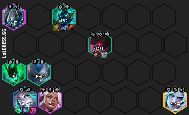 잭스의 경우 사실 철갑 시너지를 위한 기물이기 때문에 앞 라인에 배치하여 조금이라도 시간을 끌게 해주며 적의 공격이 메인 탱커인 헤카림에게 집중되게끔 마찬가지로 맨 앞에 배치합니다. 그 뒤에는 세주아니, 노틸러스, 쓰레쉬를 배치해주고 렐의 경우 어차피 기병대라 상대에게 근접하기 때문에 아무대나 배치해도 되겠습니다. 비에고의 경우 상대방의 메인 딜러쪽으로 날아가게끔 상황을 보면서 맞춰주면 되구요.