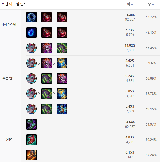 보통 시작은 도란의 반지와 포션 두 개를 구매해줍니다. 초반 마나가 부족할 수도 있으니 스킬을 마구잡이로 사용하면 안되며 첫 복귀시 사라진 양피지를 구매해주시면 됩니다. 이후 첫 번째 코어 아이템으로 리안드리의 고뇌를 선택해주시고 마관신을 올린 뒤 악마의 포옹, 모렐로노미콘을 올려주시면 되겠습니다. 그 이후부터는 상황에 맞게 올려주시면 되는데 상대 암살자가 자꾸 자신을 물어 죽는다면 존야의 모래시계를, 더 딜링이 필요하면 지평선의 초점을, 상대가 마법 저항력 아이템을 많이 올렸다면 공허의 지팡이를 올려주시면 됩니다.