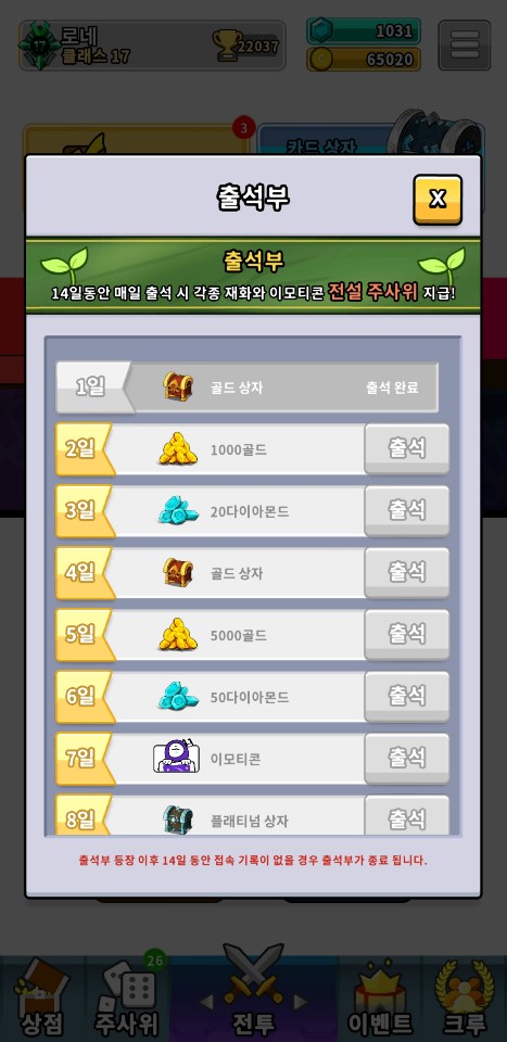 기존 다른 모바일 게임들을 보면 대부분 출석 이벤트가 항상 존재했엇는데요, 랜덤다이스도 출석부가 업데이트 되었습니다. 출석을 할 때마다 골드, 상자, 다이아몬드, 이모티콘 등을 얻을 수 있으며 특히나 14일차에는 전설 상자를 주기 때문에 전체적으로 봤을때 신규 유저들이 더 편하게 전설 주사위를 얻을 수 있게된 것 같습니다.