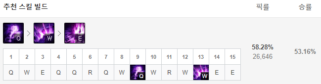 처음 시작인 3레벨에는 Q, W, E스킬을 각자 하나씩 찍어준 뒤 그 이후부터는 R-Q-W-E 순서로 스킬을 마스터해주시면 되겠습니다. 궁극기를 제외하고 Q, W, E 순서로 스킬을 찍는 이유는 순서대로 스킬을 올렸을 때 딜링이 더 잘나오기 때문이죠.