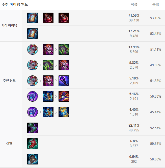 처음 시작에는 사라진 양피지와 포션 두 개로 시작해줍니다. 초반 마나 부족을 피하는 동시에 첫 코어 아이템인 리안드리의 고뇌의 하위템이기도 하죠. 그렇게 리안드리의 고뇌를 올려준 뒤 마법사의 신발을 올려주세요. 그 이후에는 악마의 포옹과 모렐로노미콘을 올려주시고 그 다음부터는 상황을 보고 딜이 부족하면 라바돈의 죽음 모자, 상대팀이 마법 저항력 아이템을 많이 ㄷ루렀다면 공허의 지팡이, 생존력이 필요하다면 존야의 모래시계를 올려주면 되겠습니다.