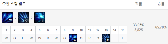 1레벨은 W를 찍어 아군 정글러 리쉬를 끝내준 다음 피가 어느정도 남아있는 미니언들을 W스킬로 한꺼번에 잡아줍니다. 그러면서 W스킬로 적들을 견제하면서 2레벨에는 Q스킬을, 3레벨에는 E스킬을 찍어주죠. 그 이후부터는 R-Q-E-W 순서로 스킬을 마스터해주시면 되겠습니다.