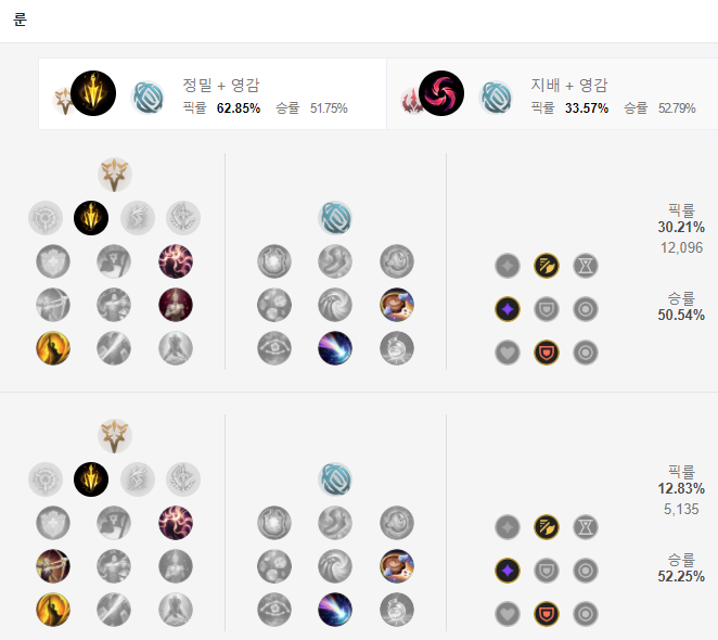 애쉬는 공격 속도를 중요시 하는 챔피언이기에 정밀의 치명적 속도를 메인 룬으로 사용합니다. 극초반과 극후반에 굉장히 강력한 룬이며 하위 룬으로는 마나 회복을 위한 침착, 피흡을 보충하는 전설: 핏빛 길, 딜링을 올리는 최후의 일격을 들어주며 보조룬으로는 영감의 유지력을 위한 비스킷 배달과 추격에 도움을 주는 쾌속 접근을 선택해주시면 되겠습니다.