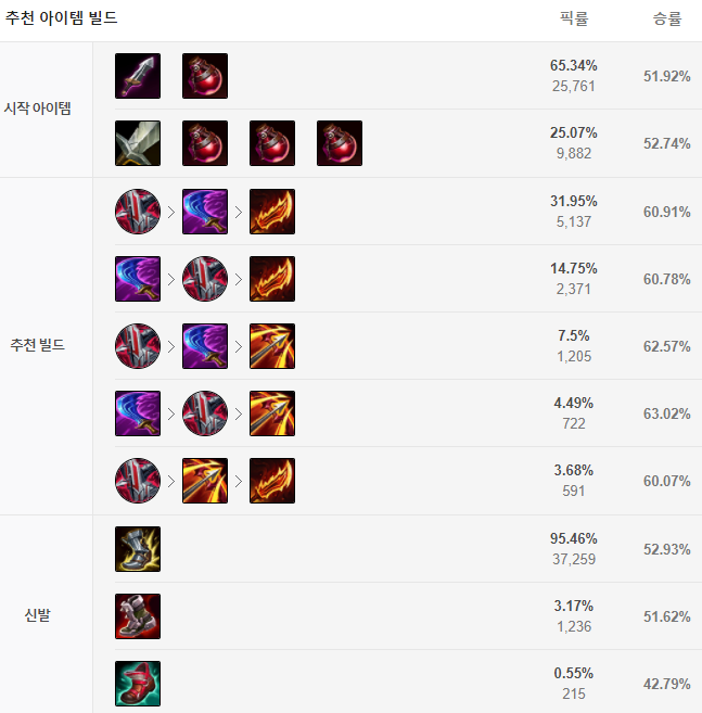 애쉬의 템트리는 처음 시작은 도란의 검에 포션 두 개로 시작합니다. 그 이후 첫 번째 코어 아이템으로 불멸의 철갑궁을 올려주는데 이는 도주기가 없는 애쉬의 생존력을 크게 올려주는 역할을 합니다. 이후 광전사의 군화를 올려준 다음 두 번째 코어 아이템으로는 마법사의 최후를 올려주시고 세 번째 코어 아이템으로는 구인수의 격노검을 올려주면 됩니다. 그 다음부터는 상황에 맞게 생존력이 필요하면 수호 천사를, 공격 속도가 필요하면 루난의 허리케인을, 흡혈이 필요하면 몰락한 왕의 검, 피바라기 등을 올려주시면 되겠습니다.