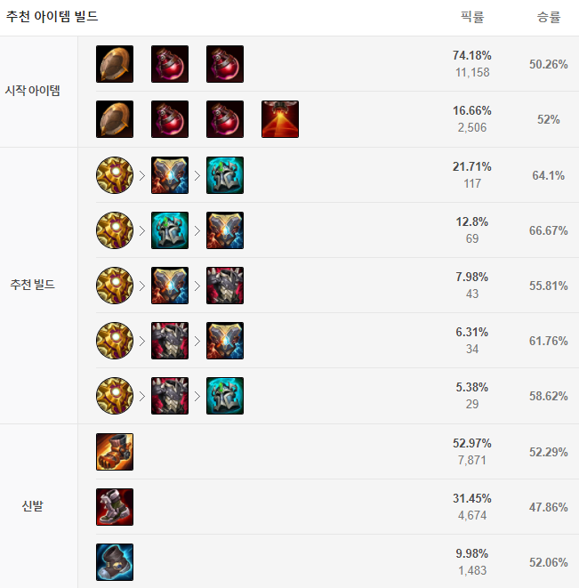 템트리는 고대유물 방패와 포션 두개로 시작해주고 첫 코어 아이템으로 강철의 솔라리 펜던트를 올려줍니다. 이후 기동력의 장화를 올려주고 두 번째, 세 번째 코어 아이템으로 가격이 저렴한 전설템인 지크의 융합과 기사의 맹세를 띄워줍니다. 아군이 자주 죽으면 기사의 맹세를 먼저, 알아서 잘 살아남는다면 지크의 융합을 먼저 올려주시면 되겠습니다. 그 다음에는 상황을 보고 상대팀에 AP가 쎄면 심연의 가면을, AD가 쎄면 가시 갑옷을 올리시면 되고 마지막에는 신발을 판금 장화나 헤르메스로 바꾸는 것도 좋습니다.