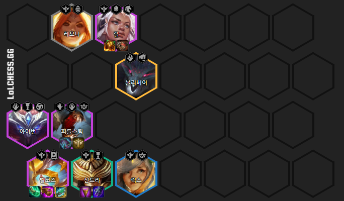 먼저 이 덱은 레오나와 렐을 가장 앞 라인에 넣어줍니다. 그리고 볼리베어를 바로 그 뒤칸에, 아이번과 피들스틱을 그 뒤에, 마지막으로 맨 뒤에는 벨코즈와 신드라, 럭스를 넣어주면 됩니다. 이렇게 배치된 이유는 볼리베어가 혹시라도 너무 빨리 녹아서 스킬을 못 사용할 가능성을 줄이고, 또 아래쪽 딜러진들에게 어그로가 쏠려도 아이번의 스킬로 데이지를 소환하여 적들을 한 번 공중으로 띄우면서 신드라가 가까운 적을 멀리 날려서 벨코즈가 최대한 스킬을 사용하도록 하는 배치죠.