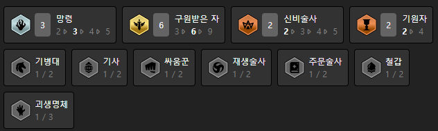 이 덱에서 챙길 수 있는 시너지는 망령(3), 구원받은 자(6), 신비술사(2), 기원자(2)입니다. 기원자의 경우 모든 챔피언들에게 적용되기 때문에 벨코즈의 마나 수급에 도움이 되겠죠? 또 혹여 장기전이 되어 9레벨을 달성한다면 그웬을 넣어 신비술사(3) 시너지를 챙길 수도 있고 아니면 가렌을 넣어 기사(2) 시너지를 챙길 수도 있습니다.