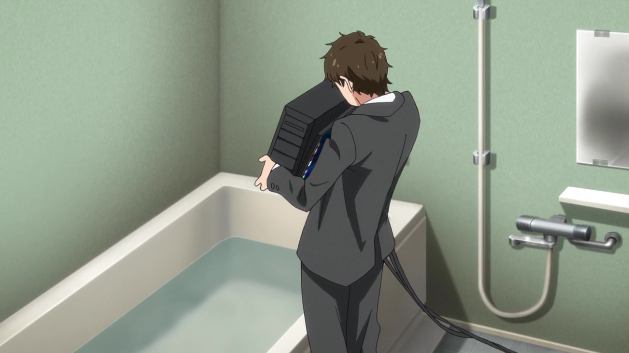 한편 목숨을 구해진 후배는 주인공의 마지막 유언대로 컴퓨터 본체를 욕조 물에 담구며 그렇게 1화는 끝이 납니다.