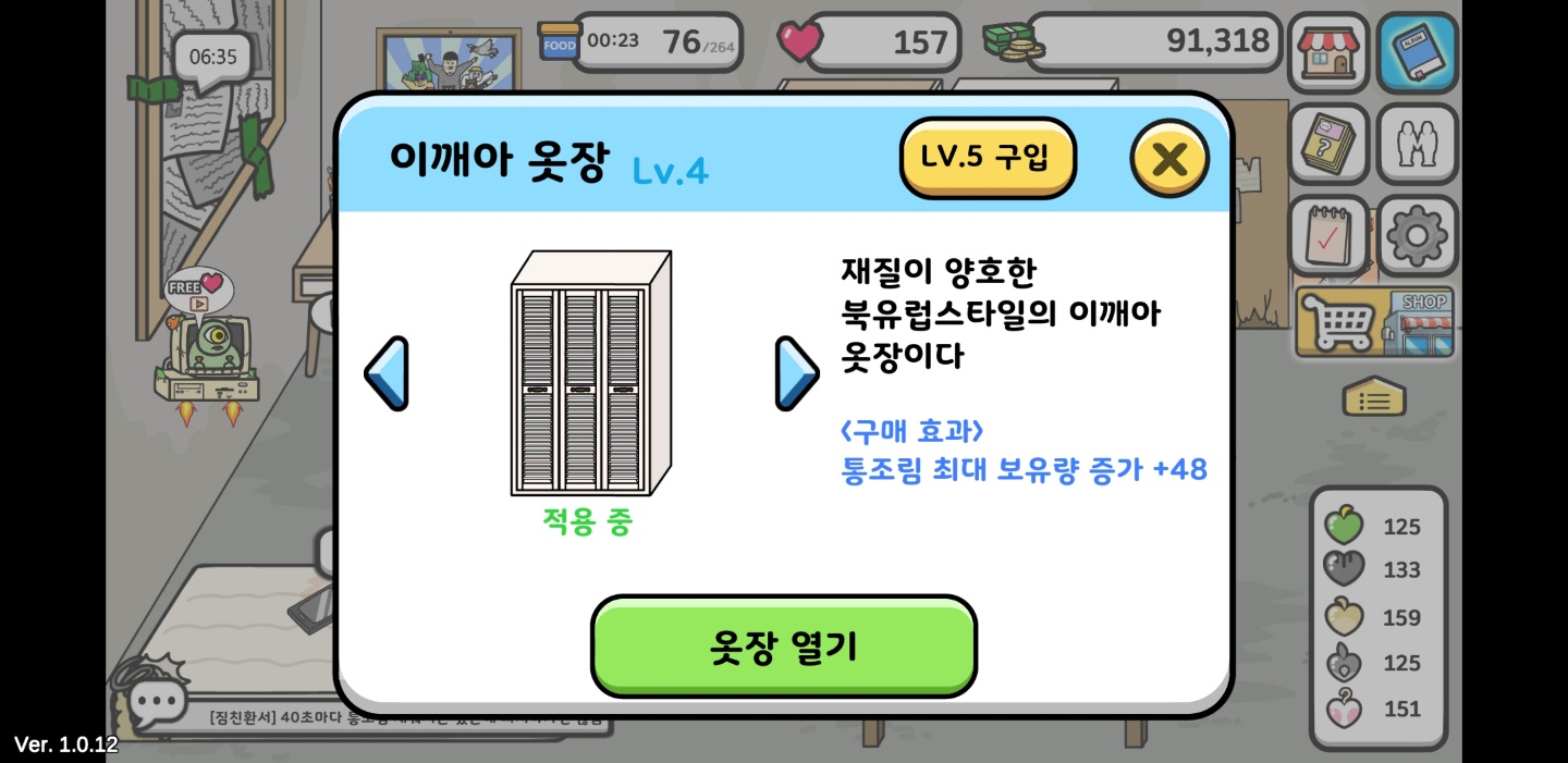 대기화면에 있는 옷장을 클릭하여 옷장을 열면 짐승친구들의 스킬레벨을 확인 및 강화할 수 있습니다.