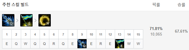 스킬 빌드의 경우 1레벨에는 E, 2레벨에는 Q, 3레벨에는 W를 찍어주고 이후부터는 R-Q-E-W 순서로 스킬을 마스터해줍니다. 궁극기를 제외하고나면 Q스킬이 제일 핵심 스킬이기 때문이죠.