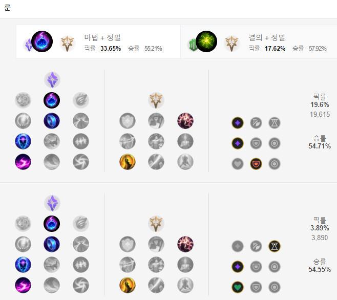 마오카이의 E스킬에 맞으면 슬로우가 걸리기 때문에 유성을 들어주는 경우 E스킬을 맞으면 도주기나 점멸을 쓰지 않는 이상 유성도 확정타로 들어갑니다. 그렇기 때문에 마법의 신비로운 유성을 들어주고 하위 룬으로는 마나 회복을 위한 마나순환 팔찌, 쿨감을 위한 깨달음, 깨알 딜링을 위한 주문 작열을 들어주고 보조룬에다가는 정밀의 침착과 최후의 일격을 들어주면 되겠습니다.