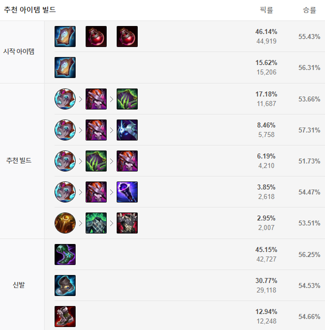 위에서도 말했다시피 칼바람 마오카이는 AP아이템을 올려 서브 딜러 역할을 담당합니다. 그렇기 때문에 우선 시작 아이템은 사라진 양피지와 포션 두 개를 구매해줍니다. 이후 첫 번째 코어 아이템으로는 리안드리의 고뇌를 올려주시고, 마관신을 올려줍니다. 두 번째 코어 아이템으로는 악마의 포옹, 세 번째 코어 아이템으로는 모렐로노미콘까지 올려주신 뒤 그 이후부터는 상황을 보고 아군에 탱커가 필요할 것 같다 하면 가시 갑옷, 정령의 형상, 가고일 돌갑옷같은 템을 올려주고 딜을 더 늘려야겠다고 생각되면 우주의 추진력, 공허의 지팡이 등을 올려주시면 되겠습니다.