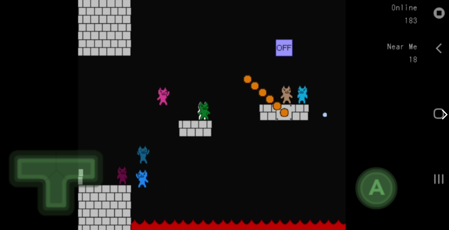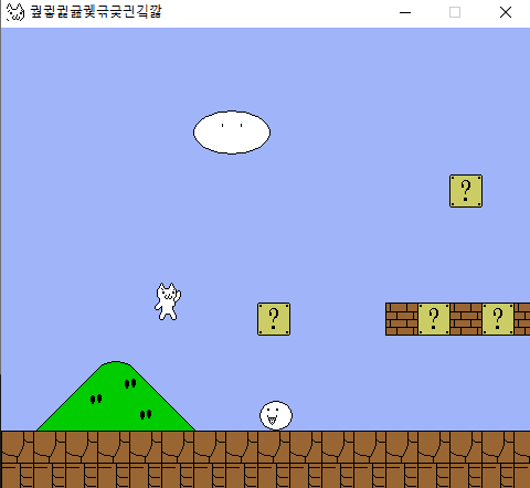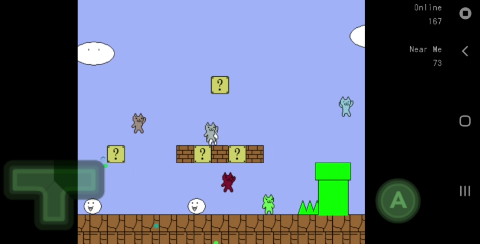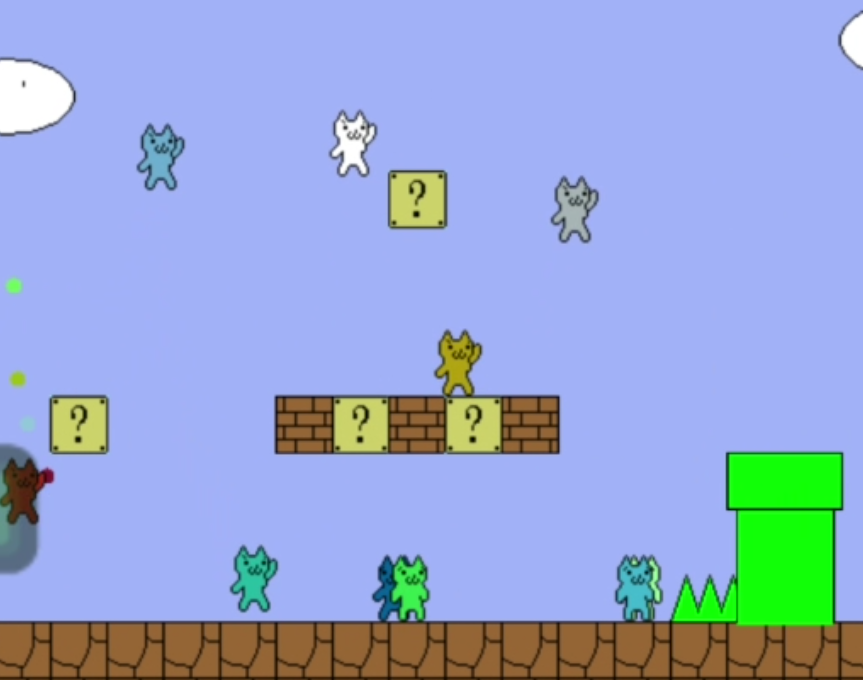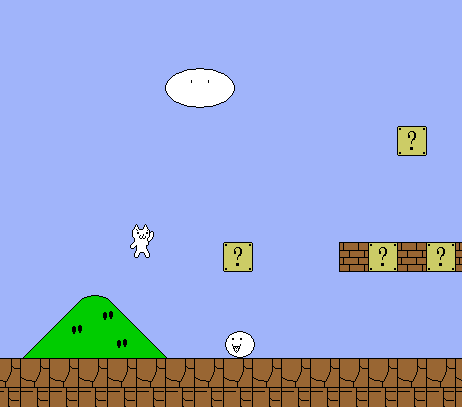바로 위의 이미지가 고양이 마리오 게임 플레이 스크린샷인데요, 고양이 같은 캐릭터로 진행이 되고 구성이 슈퍼마리오와 거의 비슷하여 고양이 마리오라는 이름이 붙었습니다. 게임 방법은 굉장히 간단한데요, 그냥 장애물들을 피하거나 해서 계속 앞으로 나아가면 됩니다.