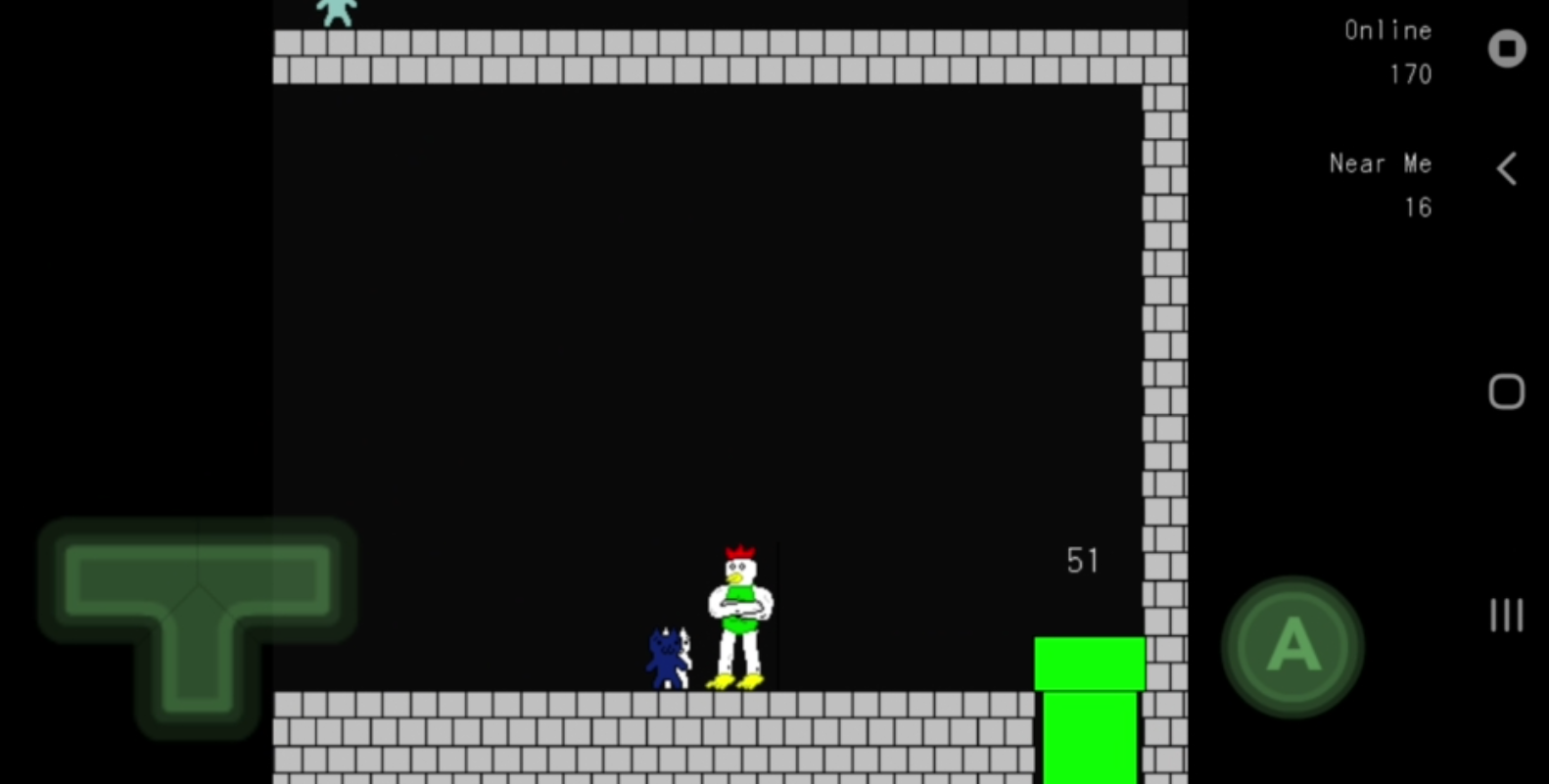 모바일 조작법은 화면 좌측 아래에 있는 방향키로 움직일 수 있고, 우측 아래 A버튼으로 점프를 할 수 있습니다. 개인적으로 옛날에 엄청 많이 해봤는데 그게 기억에 남아 여차여차 클리어까지 갔습니다. 10분정도 소모되었네요. 패턴을 다 알고 있다고 해도 컨트롤이 딸리면 죽으니 힘듭니다.