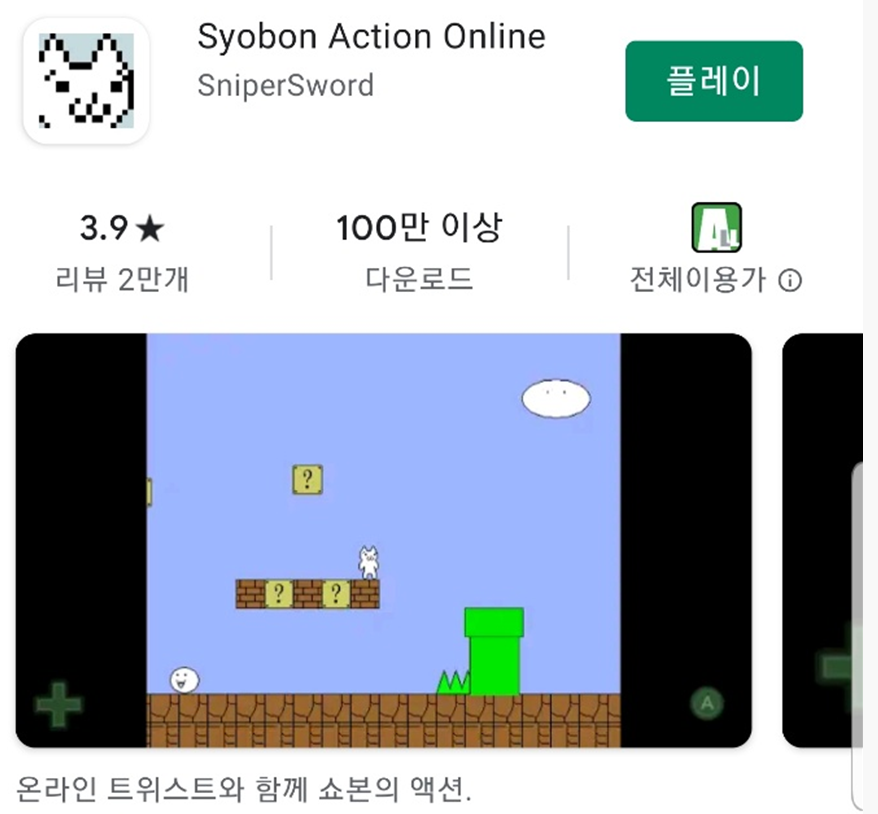 이번 시간에는 고양이 마리오로 유명한 게임을 한번 소개해드리려고 합니다. 게임 방법은 간단하나 클리어는 굉장히 어렵다는 게임으로 사실 본래 게임 이름은 쇼본의 액션이라고 합니다. 하지만 국내에서는 인터넷 방송인들이 고양이 마리오 게임으로 소개하여 사실 고양이 마리오로 굳어졌죠. 여하튼 한번 게임을 소개해드리고 PC버전, 모바일버전으로 둘 다 고양이마리오 게임을 하는 방법까지 한번 정리해보도록 하겠습니다.