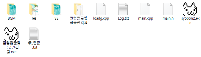 먼저 위에 있는 파일을 받아서 압축을 풀어줍니다. 압축을 풀어주면 위의 이미지와 같은 파일들이 있을텐데요, 저기에서 syobon2를 실행해주면 고양이 마리오 게임이 실행됩니다.