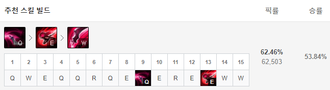 칼바람 카타리나 스킬의 경우에는 처음 3레벨 시작에 Q, W, E스킬을 하나씩 찍어줍니다. 이후 R-Q-E-W 순서로 스킬을 마스터해주시면 되겠습니다. Q스킬을 E, W스킬보다 더 빨리 마스터해주는 이유는 Q스킬이 메인 딜링 스킬이고 원거리 공격 스킬이기 때문입니다.