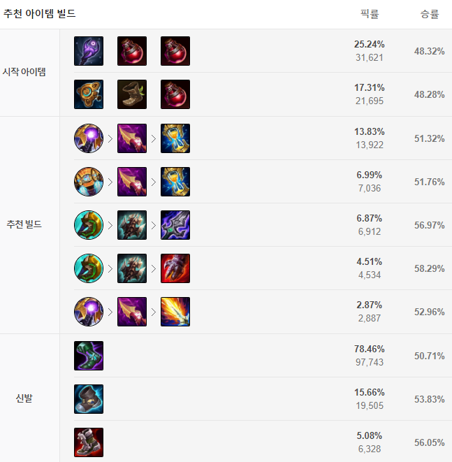 카타리나는 템트리를 AP, AD 둘 다 갈 수 있다는 큰 장점이 있습니다. 따라서 아군 조합을 보고 AP딜러가 더 많으면 AD템트리를, AD딜러가 더 많으면 AP를 올려주시면 됩니다. AP 템트리의 경우 균열 생성기 - 마법사의 신발 - 내셔의 이빨, 존야의 모래시계 순서로 올려주시면 되고 AD 템트리의 경우 신성한 파괴자 - 헤르메스 or 판금 장화 - 거대한 히드라 - 몰락한 왕의 검 순서로 템을 올려주시면 되겠습니다.