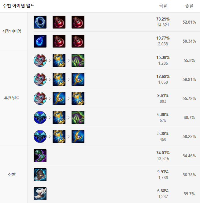 시작 아이템은 도란의 반지와 포션 두 개로 시작해줍니다. 이후 첫 귀환에서는 마나 소모를 감당하기 위해 여신의 눈물을 구매해주시고 그 상태에서 사라진 양피지 아이템을 올려주면서 마나 부족을 감당해냅니다. 그러고 첫 번째 코어 아이템으로는 리안드리의 고뇌를 올리신 뒤 두 번째 코어 아이템으로는 존야의 모래시계, 그리고 세 번째 코어 아이템으로는 대천사의 지팡이를 올려주시면 됩니다. 신발은 첫 번째 코어 아이템을 띄워준 뒤 마법사의 신발을 올려주고 여기까지 완성되었으면 이후부터는 상황에 맞게 모렐로노미콘이나 공허의 지팡이, 악마의 포옹 등을 올려주시면 됩니다.