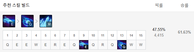 애니비아의 스킬 빌드는 1레벨에는 Q를 찍고 2레벨, 3레벨에는 E, 4레벨에는 W 그리고 그 이후부터 R-E-Q-W 순서로 스킬을 마스터해줍니다. E스킬이 핵심 딜링 스킬이기 때문에 먼저 마스터해주는 것이죠. 주로 사용되는 콤보는 Q스킬을 맞추고 E스킬을 확정타로 맞추는 것입니다. 6레벨 이후부터는 궁극기를 이용하여 더 각을 잘 만들어낼 수 있고 또한 W스킬로 벽을 통해서도 더 좋은 각을 만들어낼 수 있죠.