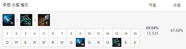 1레벨에는 Q스킬을 찍어주고 2레벨에는 W, 3레벨에 E스킬을 찍어줍니다. 그 이후부터는 R-W-Q-E 순서로 스킬을 마스터해줍니다. W스킬로 인한 기본 공격 3타가 핵심 딜링이기 때문에 E스킬을 먼저 마스터해주는 것이죠.