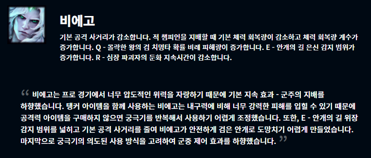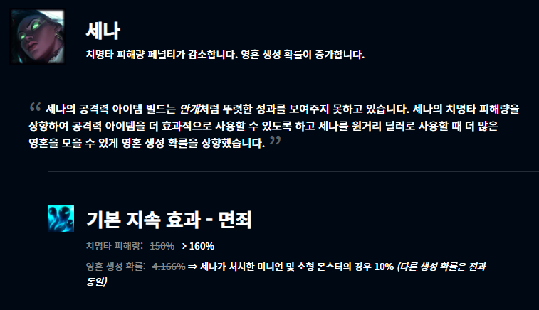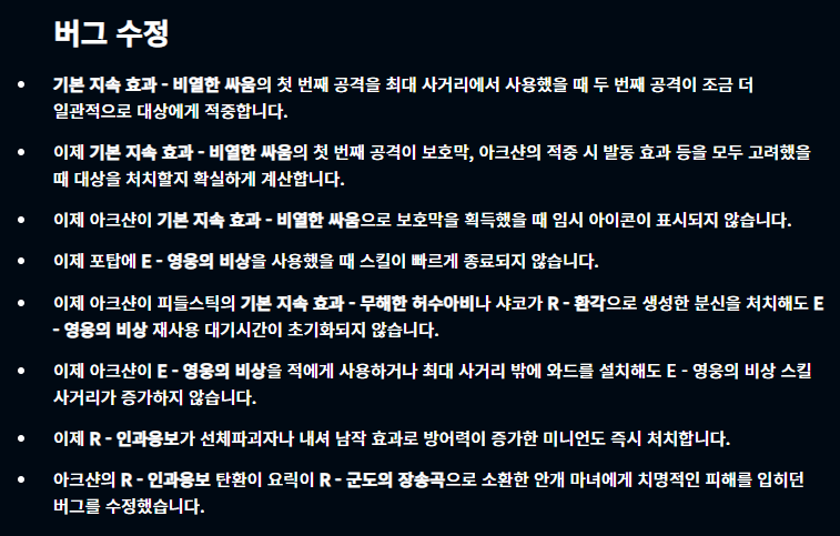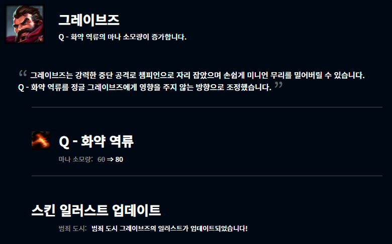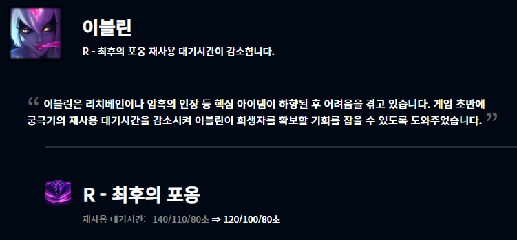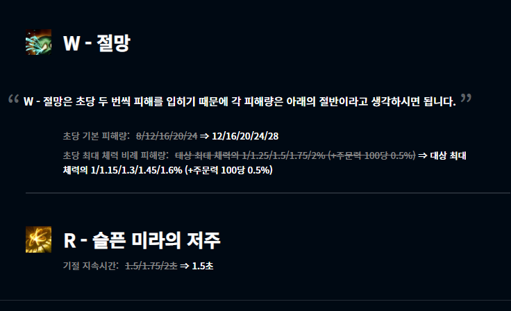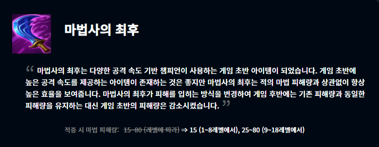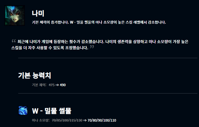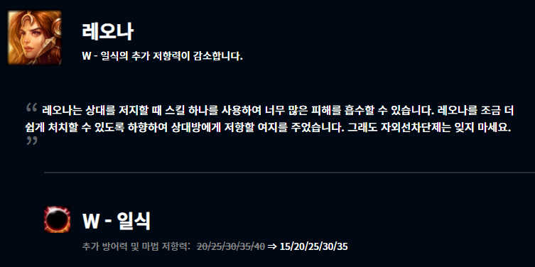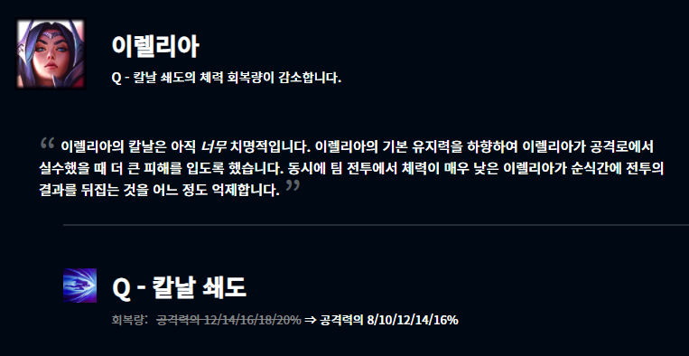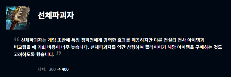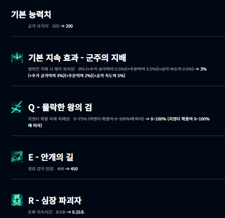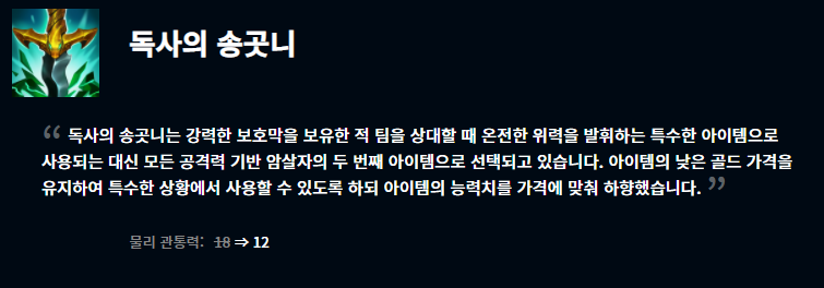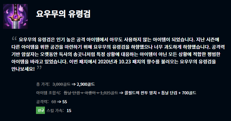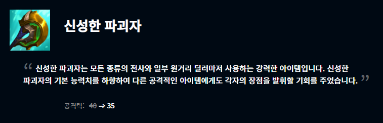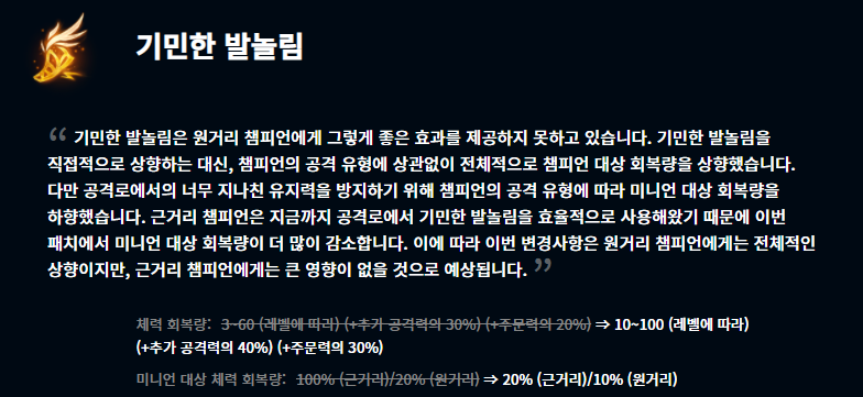 너무 과도하게 많은 챔피언들이 올리는 신성한 파괴자를 너프했고 그 외에 잘 올리지 않거나 기회비용이 너무 높거나 한 선체파괴자, 독사의 송곳니, 마법사의 최후, 요우무의 유령검을 버프했네요. 또 룬에서는 기민한 발놀림이 변경되었는데 기민한 발놀림을 사용하는 챔피언들 중 근거리 챔피언에게는 너프, 원거리 챔피언에게는 버프가 되었습니다.
